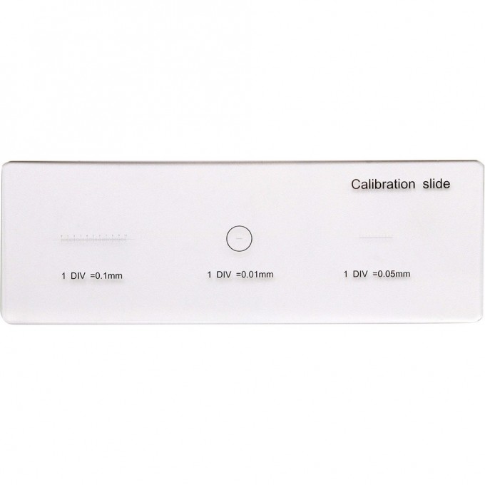 Слайд Levenhuk 3 сделан из оптического стекла и имеет три нанесенные шкалы с разной ценой деления: 0,1 мм, 0,01 мм и 0,05 мм. По размерам он идентичен стандартному предметному стеклу.